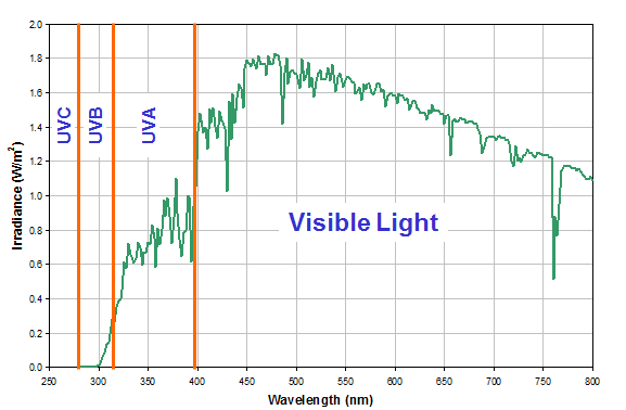 UV-C(100-280nm):外太空環(huán)境,穿透能力最弱,無(wú)法穿透大部分的透明玻璃及塑料。日光中含有的短波紫外線幾乎被臭氧層完全吸收
