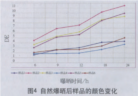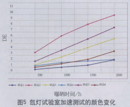 上圖是某樣品自然曝曬與實(shí)驗(yàn)室加速的數(shù)據(jù),以顏色變化作為老化的評(píng)判指標(biāo)。