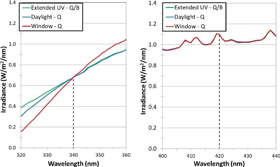 Q-SUN420nm傳感器使用420nm干涉濾波器。因為420nm處的SPD對于每個濾光器都是相對水平的(圖1,右),我們有一個單一的轉(zhuǎn)換因子UC20/420傳感器,對所有這些傳感器都是準確的。Q-TIPREP#38 將涵蓋寬帶總紫外線(TUV)輻射計。