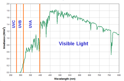 圖1:UVA/UVB/UVC在光譜中的位置,通常戶外最多用到UVB,氙燈用UVA的多