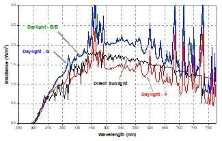 圖4:黑色的是太陽(yáng)光能譜,其它是通過濾光片模擬后的能譜,在UVA處非常相似