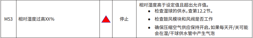 設(shè)備故障報(bào)錯(cuò)M53:相對(duì)濕度過高XX%停止運(yùn)行,需要解決故障設(shè)備才能正常運(yùn)行。我們就可以翻開設(shè)備的操作手冊(cè)查找故障原因(故障原因不會(huì)只有一個(gè))