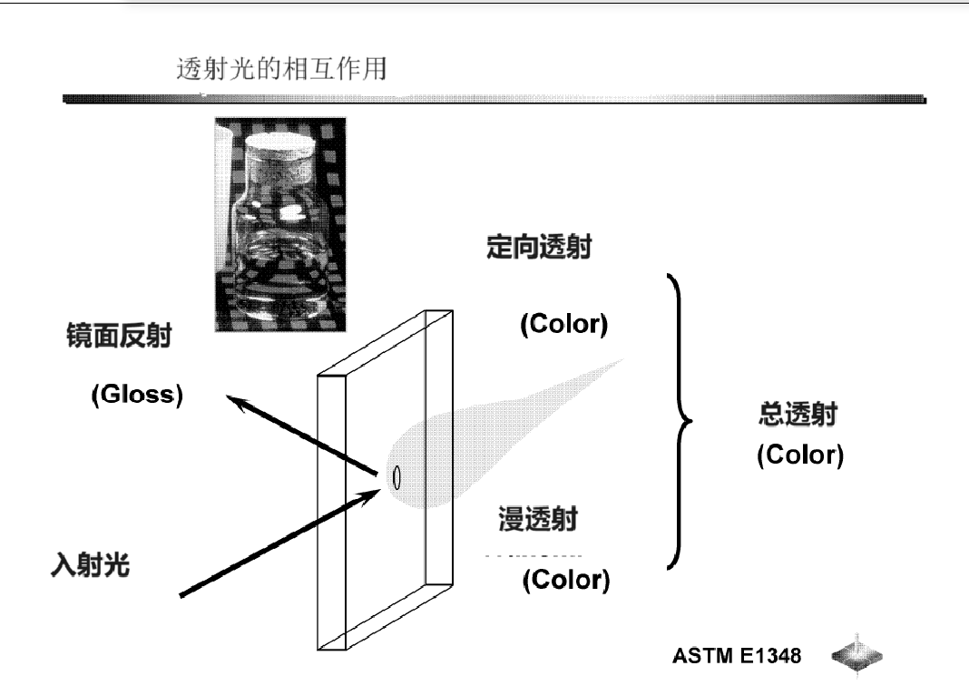 對(duì)于透明材料,光澤度(Gloss)主要是由鏡面反射決定的,顏色主要是由定向透射來決定的。(光源穿過透明樣品,傳輸方向未改變,只是強(qiáng)度因?yàn)橹?jì)的吸收而發(fā)生改變的部分叫定向透射。)