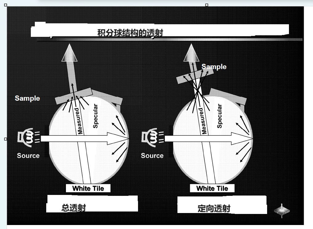 大部分的積分球測(cè)色儀都是反射用D/8°結(jié)構(gòu)(漫射照明/8°檢測(cè)),透射則是D/0°結(jié)構(gòu),總透射(TTRAN)測(cè)量(包括定向透射和漫透射),是用放在透射倉(cāng)內(nèi)靠近積分球一側(cè)的透射口來測(cè)量的。定向透射(RTRAN)測(cè)量(只包含穿透樣品方向未改變的部分)是放在透射倉(cāng)內(nèi)靠近透鏡的一側(cè)來測(cè)量的。