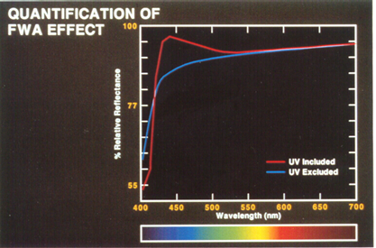 熒光增白劑(FWA)通常用于紡織、造紙和塑料行業(yè),使產品在陽光或其他包含紫外線(UV)的光源下觀察時看起來更亮麗。下圖說明了這種美白劑的光譜效應。請注意,高濃度的 FWA 在大約 420 nm 處將光譜反射率提高 100% 以上。