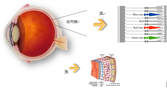 人眼內(nèi)的桿體細胞對弱光敏感,負責(zé)昏暗環(huán)境中產(chǎn)生暗視覺,只能辨別明暗;人眼內(nèi)的椎體細胞感受強光和顏色,產(chǎn)生明視覺,對物體細節(jié)和顏色分辨力強;人眼視網(wǎng)膜上有三種不同類型的椎體細胞,分別對紅光,綠光和藍光敏感。