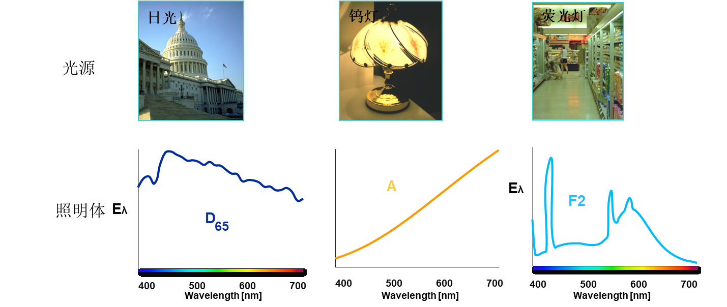 光源是真實發(fā)光的物體,CIE照明體是指用以表示光源在不同波長下相對能量的標(biāo)準(zhǔn)數(shù)據(jù)表,常用的照明體包括:A(鎢絲燈),C(平均日光),D65(正午日光),F(xiàn)2(冷白熒光)。