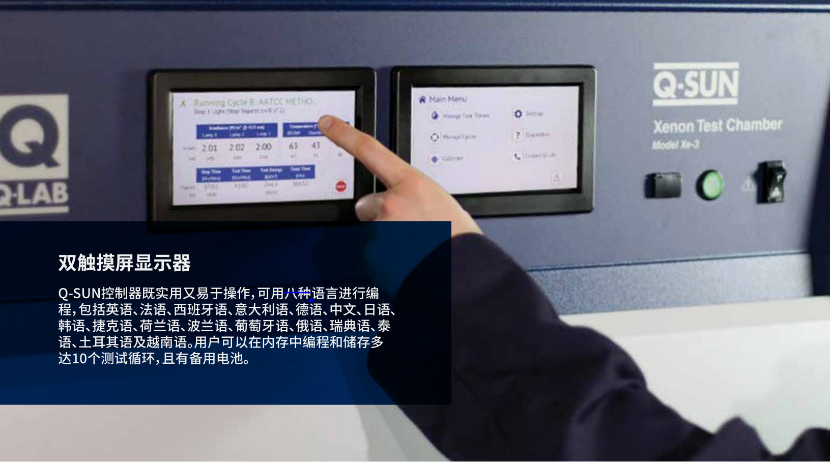 Q-SUN控制器既實(shí)用又易于操作,可用八種語(yǔ)言進(jìn)行編程,包括英語(yǔ)、法語(yǔ)、西班牙語(yǔ)、意大利語(yǔ)、德語(yǔ)、中文、日語(yǔ)、韓語(yǔ)、捷克語(yǔ)、荷蘭語(yǔ)、波蘭語(yǔ)、葡萄牙語(yǔ)、俄語(yǔ)、瑞典語(yǔ)、泰語(yǔ)、土耳其語(yǔ)及越南語(yǔ)。用戶可以在內(nèi)存中編程和儲(chǔ)存多達(dá)10個(gè)測(cè)試循環(huán),且有備用電池。