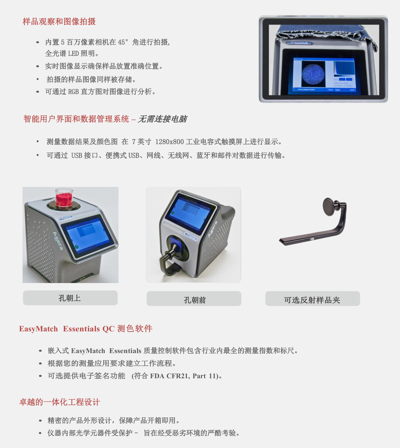 HunterLab Agera分光測(cè)色儀把顏色測(cè)量帶進(jìn)了一個(gè)新的和完全不同的先進(jìn)技術(shù)水平,與當(dāng)今市場(chǎng)上的其它任一產(chǎn)品相比,其操作更簡(jiǎn)便,自動(dòng)化程度更高、功能更多。從粉末、固體和液體到小球形、薄片、紗線或紙, Agera高端定向型色差計(jì)均能給您優(yōu)異的顏色測(cè)量,它廣泛應(yīng)用在塑料、紡織、涂料、食品、紙、化學(xué)品、藥品和建筑材料,同時(shí)配備光澤測(cè)量頭可以測(cè)量60°光澤。在不同的行業(yè)中,被廣泛稱為黃色指數(shù)儀、聚合物色度計(jì)、色差計(jì)、鈦白粉色差儀、PVC白度儀、彩板色差儀、牛仔布色差儀等。選擇不同的標(biāo)準(zhǔn)配件,即可滿足不同行業(yè)的應(yīng)用。