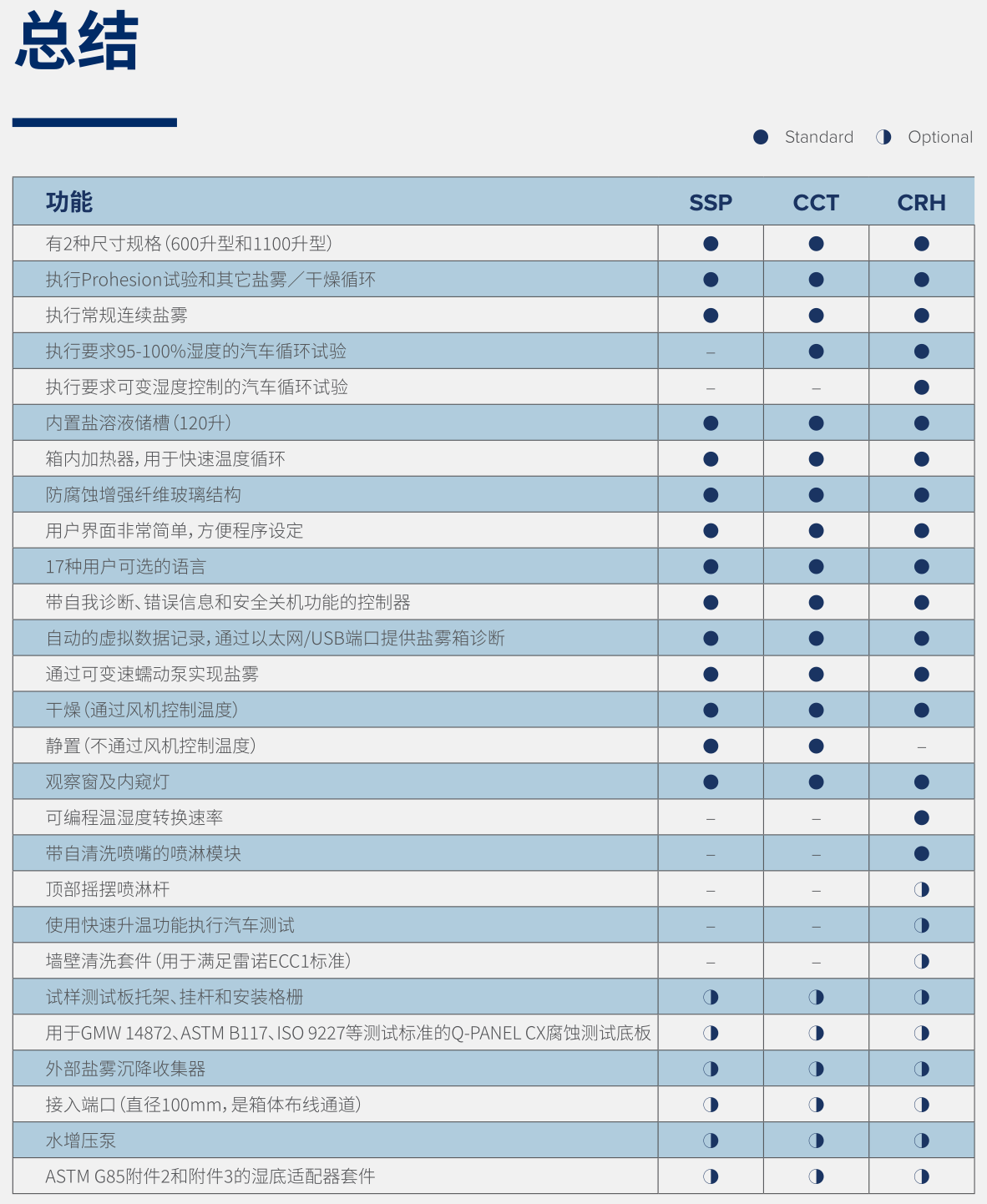SSP機(jī)型:用于Prohesion測試或傳統(tǒng)鹽霧測試 Prohesion測試使用快速循環(huán)的、溫度變化迅速的低濕度干燥循環(huán)和不同的腐蝕性溶液提供更真實的測試。 許多研究人員發(fā)現(xiàn)該測試對工業(yè)涂料很有用。 汽車腐蝕試驗方法通常要求將樣品暴露在鹽霧、高濕度、低濕度干燥和大氣環(huán)境條件的重復(fù)循環(huán)中。這些測試方法最初是作為勞動密集型手動程序開發(fā)的。多功能Q-FOG CCT腐蝕鹽霧箱是為在單個箱體中自動執(zhí)行這些循環(huán)試驗而設(shè)計的。此外,CCT型號還可以運(yùn)行銅加速醋酸鹽霧(CASS)測試,例如ASTM B368或ISO 9227 CASS。 參見LF-8110 - Q-FOG 規(guī)格說明了解對比信息, 或參見特點(diǎn)標(biāo)簽。