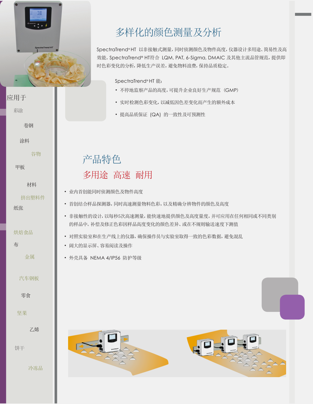 定向型0°/30°-在線色差儀。SpectraTrend HT在線色差儀(計(jì))設(shè)計(jì)堅(jiān)固耐用,可適用于各種工廠的嚴(yán)酷環(huán)境。0°/30°光學(xué)幾何結(jié)構(gòu)為“看”顏色提供了較好的角度。在線顏色測(cè)量系統(tǒng)給您提供連續(xù)的產(chǎn)品顏色信息,使您快速?zèng)Q定優(yōu)化生產(chǎn)加工過(guò)程,保證產(chǎn)品質(zhì)量。大量節(jié)省時(shí)間和人工成本。